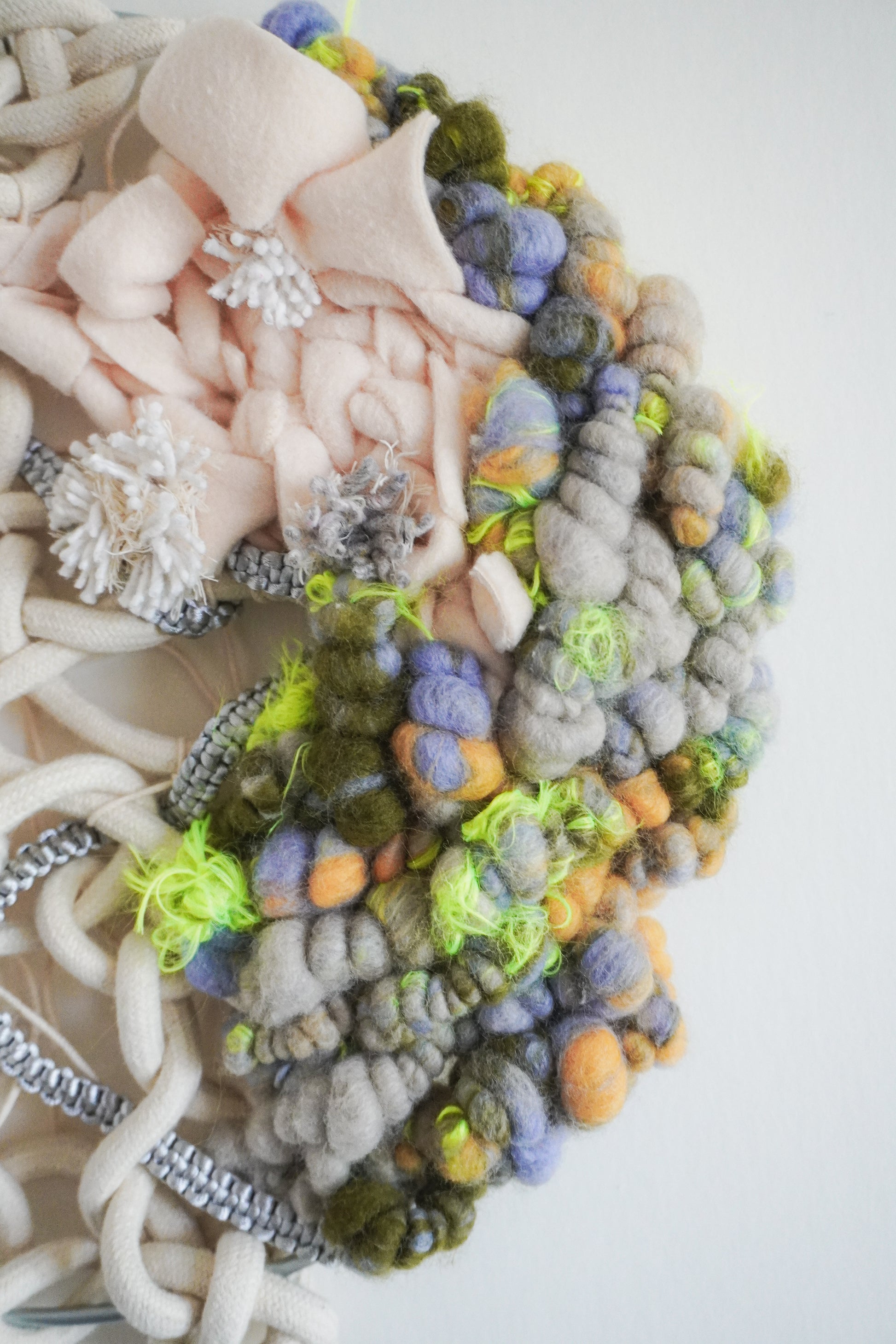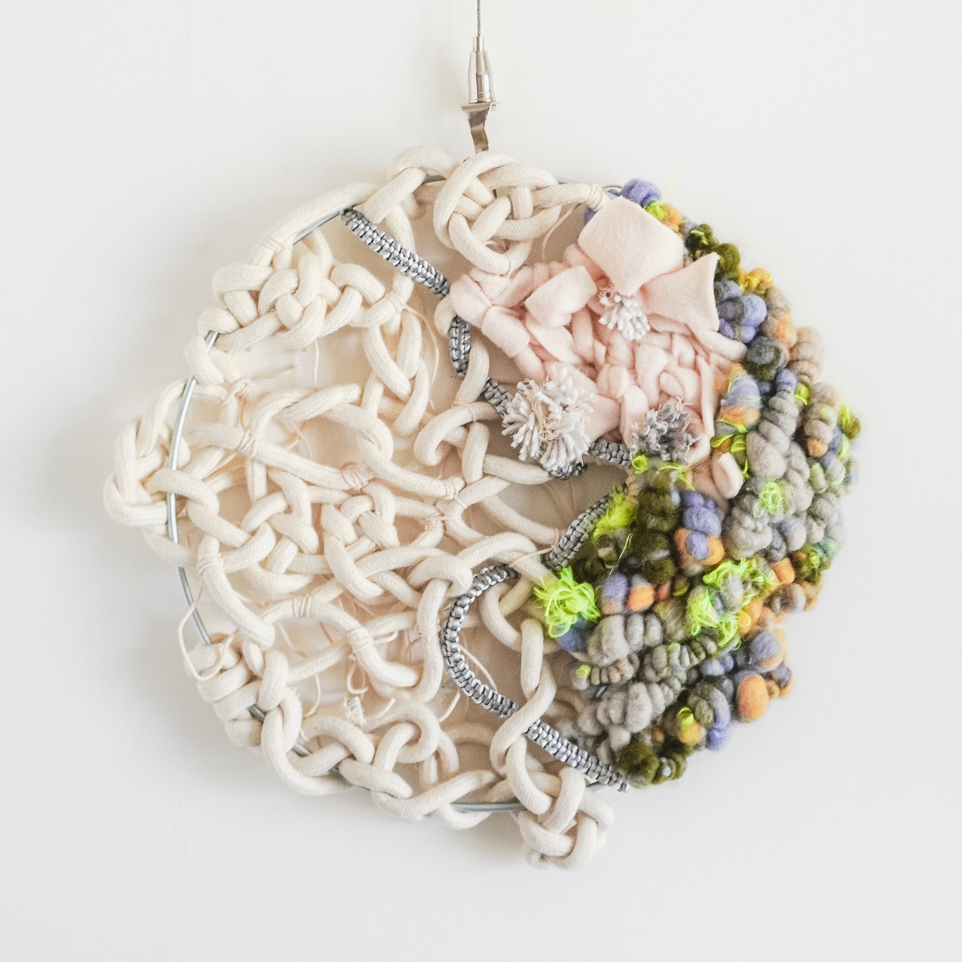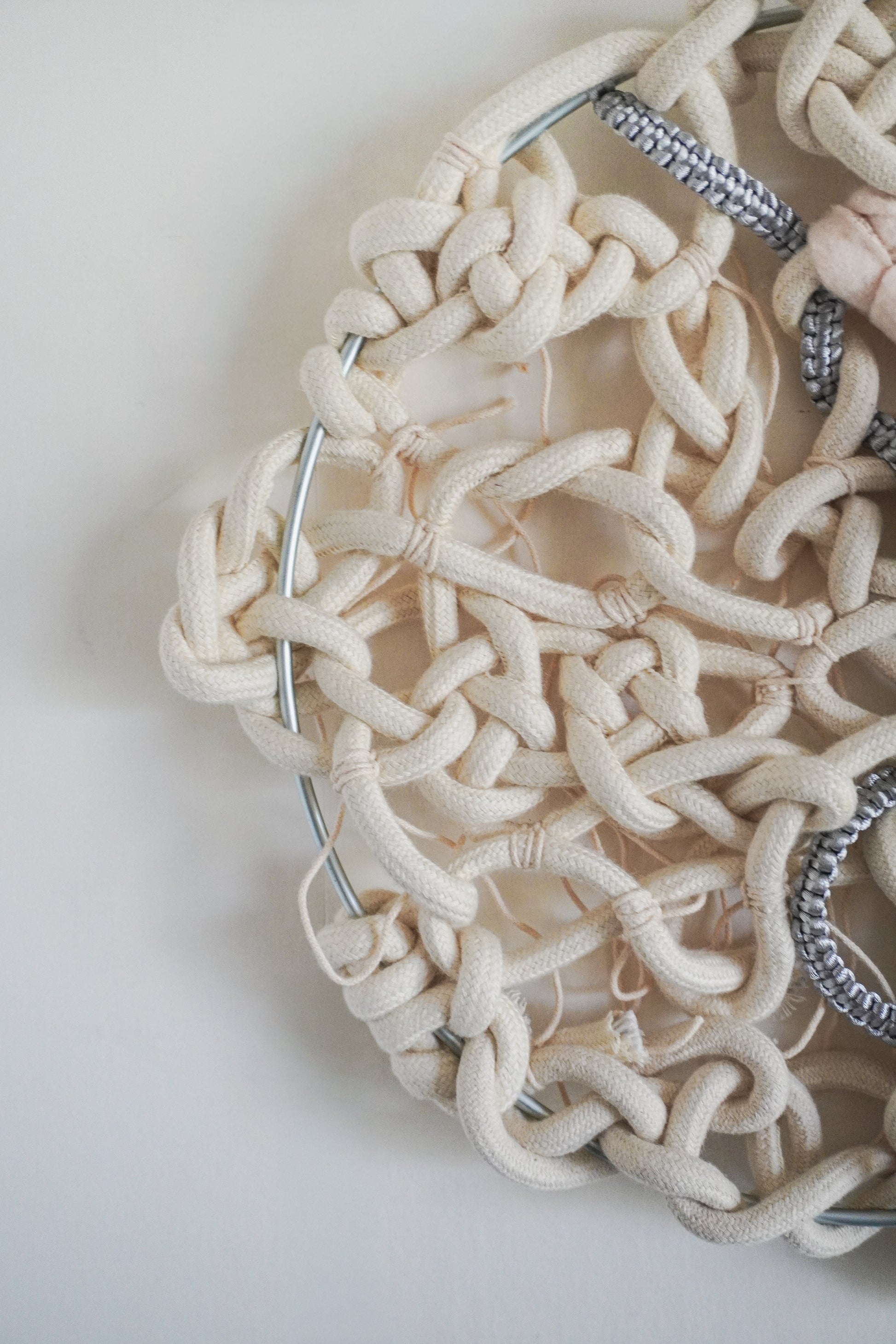Reconstructing traditional knotting with fiber remnants and cords, this series evokes roots and vines that capture transitions—intertwining past and future